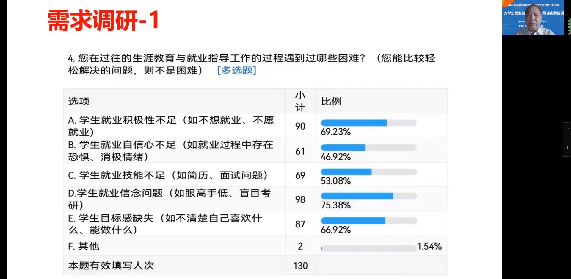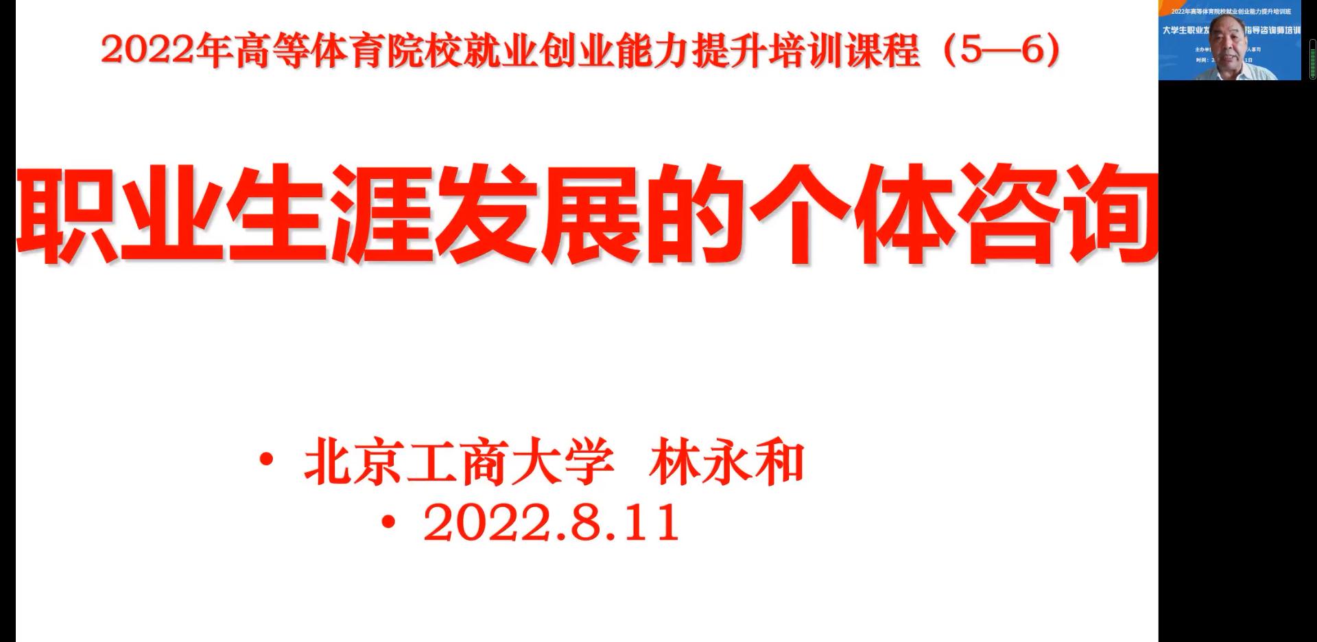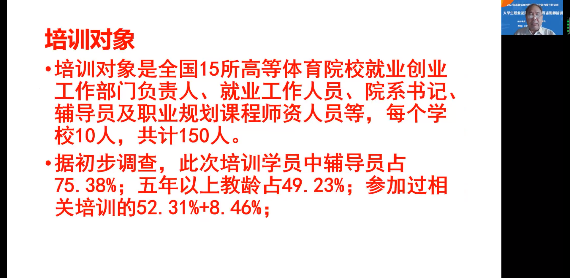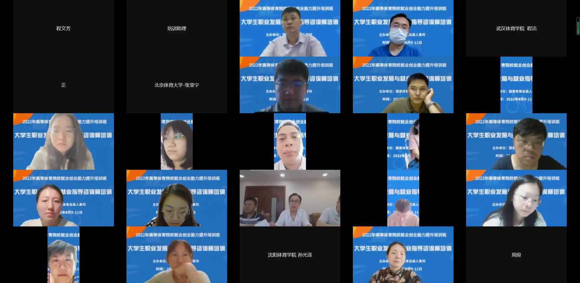 就业是民生之本,今年我国高校毕业生人数首次突破千万,2023年毕业生人数将进一步提升。受新冠肺炎疫情及经济下行压力的影响,毕业生就业形势持续复杂严峻。为贯彻落实党中央、国务院关于高校毕业生就业工作的决策部署,促进全国高等体育院校进一步做好毕业生就业工作,促进毕业生更加充分更高质量就业,体育总局人事司主办、北京体育大学承办的“2022年高等体育院校就业创业能力提升培训班”于8月中旬线上形式举办。本次培训的主题为大学生职业发展与就业指导咨询师培训,全国15所高等体育院校的就业创业工作部门工作人员、院系书记、辅导员及职业规划、就业指导课程师资人员等170余人参加培训。