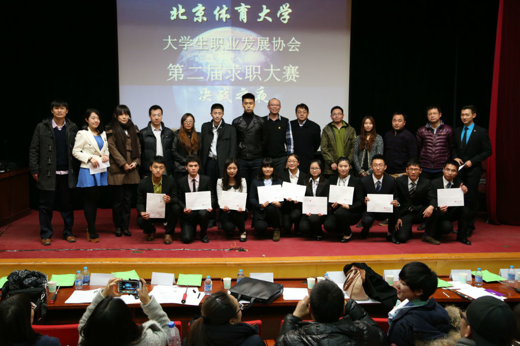 2013年11月27日晚,由大学生职业发展协会主办的北京体育大学第二届求职大赛进行了激烈而精彩的决赛环节,至此,历时一周的第二届求职大赛圆满收官。建侬、中奥、万事达、极限突破、东方启明星、汉卓、赛驰、万国、优肯阳光、华彬等十家优质企业的人力资源主管出席比赛,担任本次大赛的评委。竞技体育学院院长张霞、教育学院党总支副书记尚迎秋、就业指导服务中心副主任张卓林也作为嘉宾出席决赛现场。