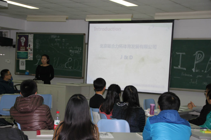 课上更是精彩纷呈,轻松活跃的课堂氛围让同学们很快融入其中。首先,北京励合力拓体育发展公司(J&D)创始人之一、体大本硕毕业生李姣简要进行了主讲老师和主办公司J&D的介绍。随后,破冰活动进行,课程正式启动。同学们在讲师的带动下,纷纷拿出手机,以微信“摇一摇”的形式找到了自己的新朋友们,并组建成五个小组,每个成员都用约一分钟时间向大家进行了自我介绍和感兴趣的部门职位,起初的沉默被朝气蓬勃的话语打破。