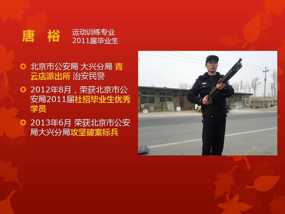 唐裕是我校运动训练专业2011届毕业生,现为北京市公安局大兴分局青云店派出所治安民警。2012年8月荣获北京市公安局2011届社招毕业生优秀学员,2013年6月荣获北京市公安局大兴分局攻坚破案标兵。报告中,他介绍了自己在学校学习、成长的历程,以及工作后对体育人的理解和感悟,鼓励同学们要珍惜同窗四年的情谊,他还分享了自己的工作感悟。