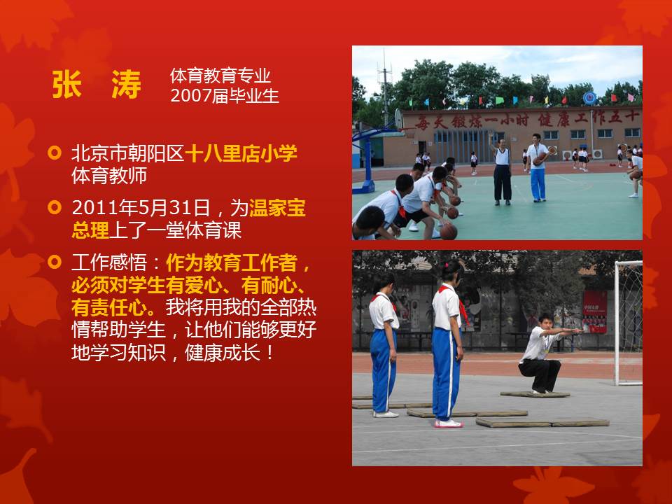 张涛是我校体育教育专业2007届毕业生,现为北京市朝阳区十八里店小学体育教师。2011年5月31日,温家宝总理来到北京市朝阳区十八里店小学,张涛作为基层体育教师的代表,担任授课教师,为温家宝总理上了一堂体育课。报告中,他介绍了温家宝总理到学校上课的背景,目前我国青少年体质状况堪忧,并且有逐年下降的趋势,温家宝总理特来到十八里店小学与同学们同上体育课,以在全社会营造重视青少年体育活动的氛围。另外,张涛还详细介绍了自己择业和工作的情况,并以一位体育教师招聘面试官的身份为学生的应聘工作提出具体建议,还对学生在校学习和未来工作提出建议。
