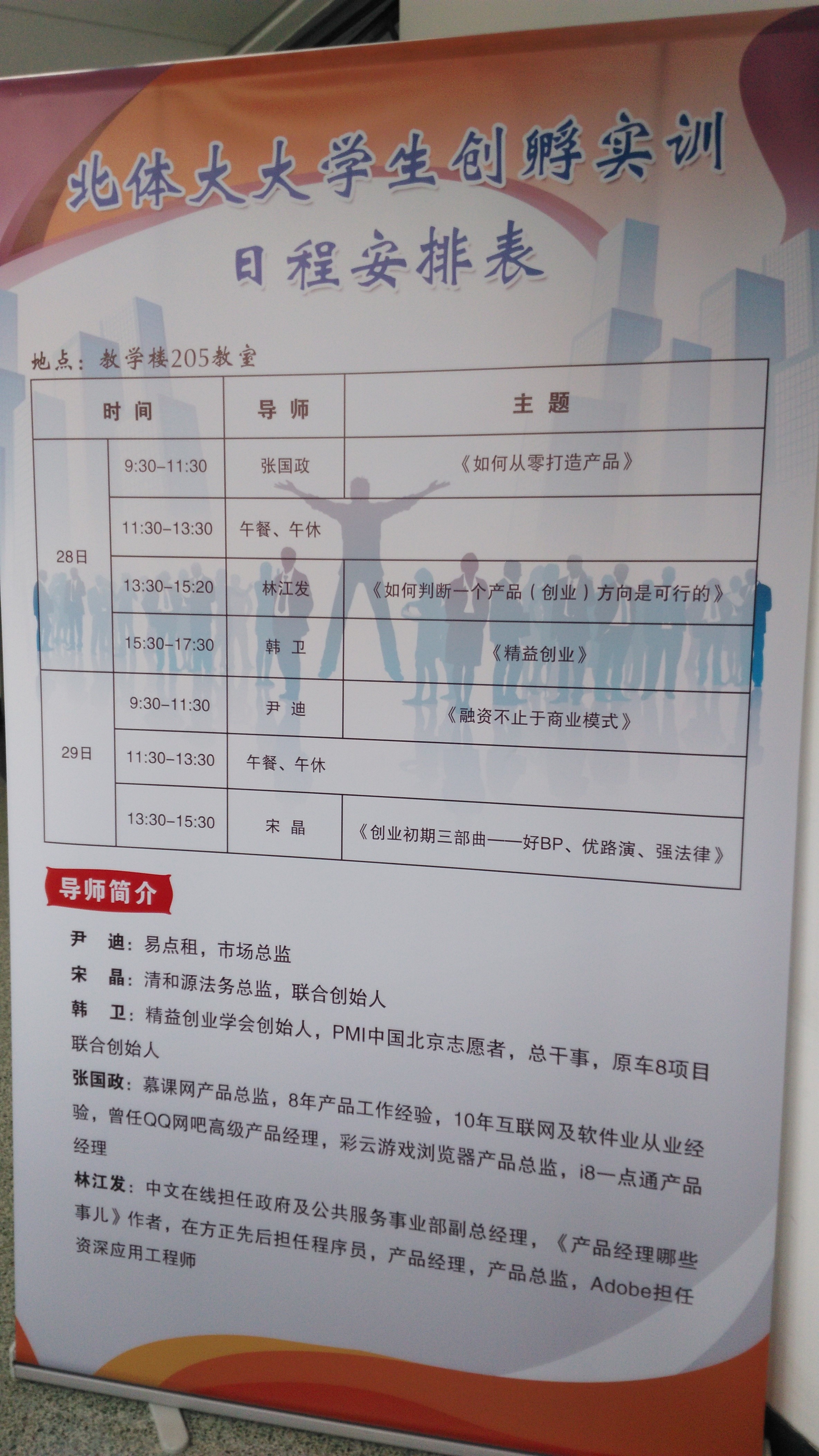 该实训课程注重实战指导、经验传授和实际问题解决,着力提升大学生创业者的创业实战素养。本次培训的讲师有:易点租市场总监尹迪,清和源法务总监、联合创始人宋晶,精益创业学会创始人、PMI中国北京志愿者、总干事、原车8项目联合创始人韩卫、慕课网产品总监张国政、中文在线政府及公共服务事业部副总经理林江发。培训内容涵盖了创业项目选择、创业路演、产品的开发、投融资等。
