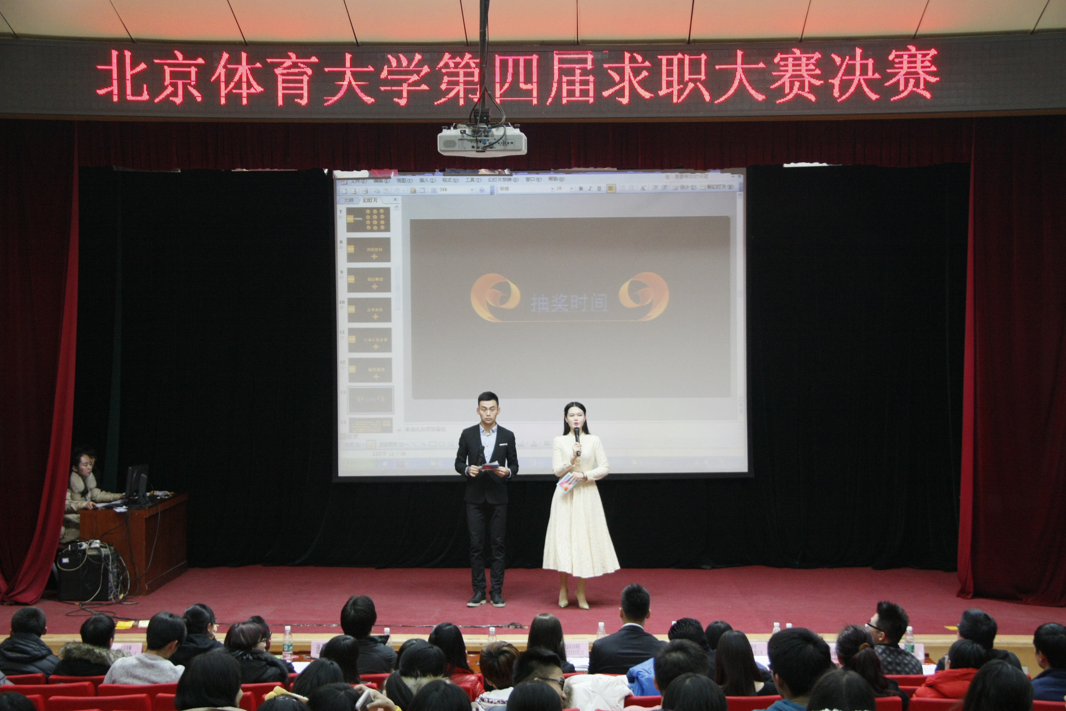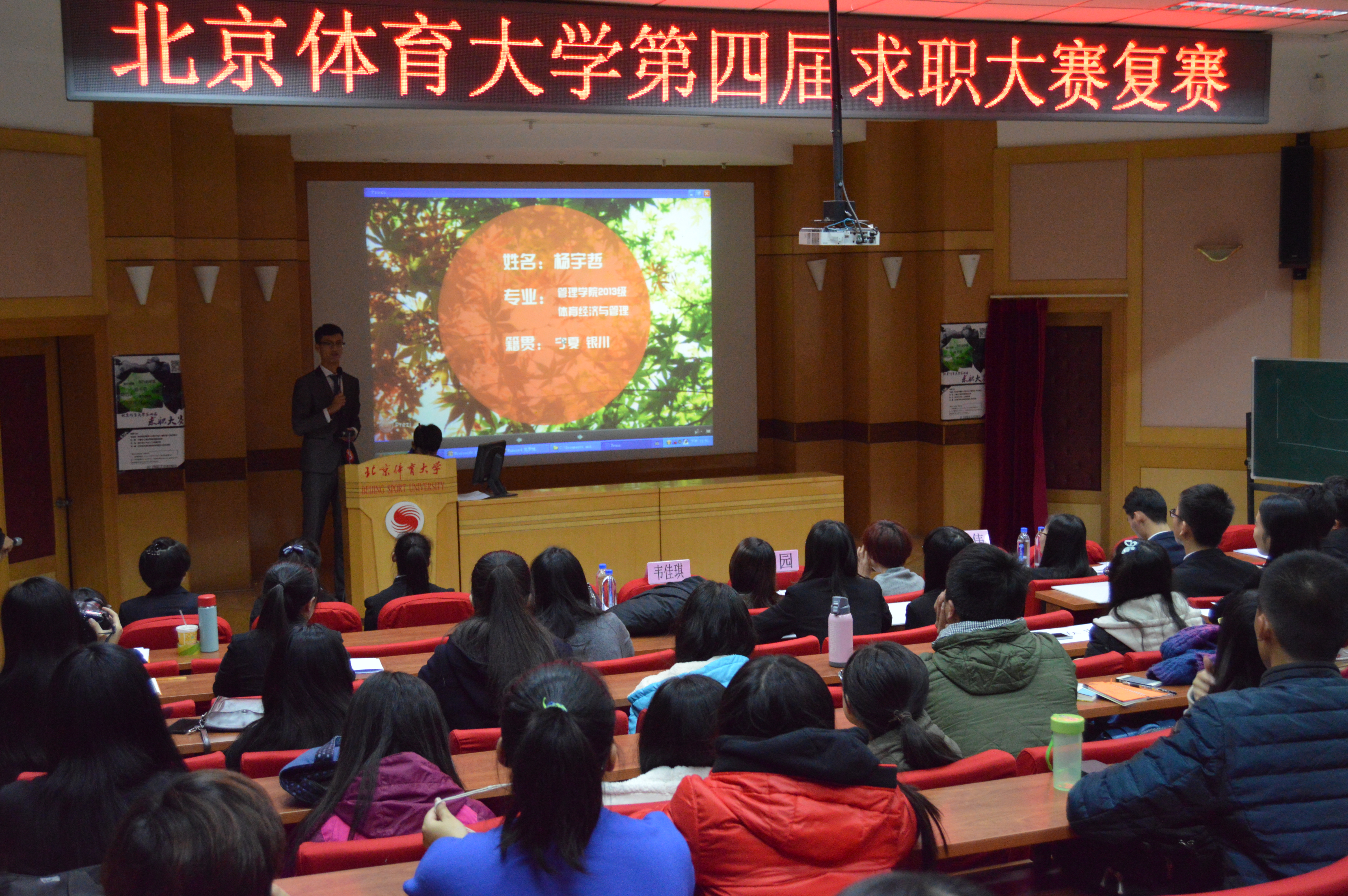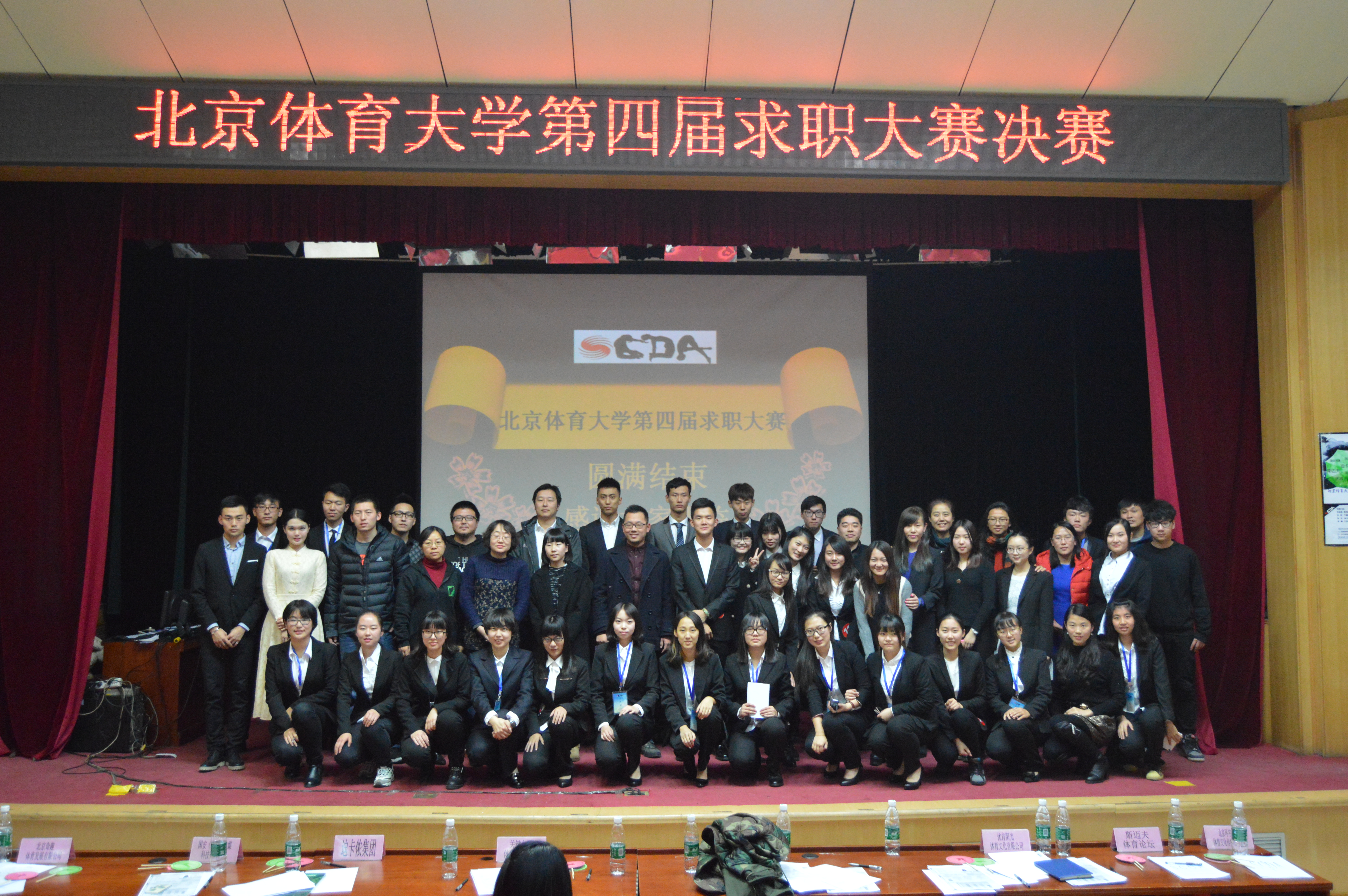 2015年11月27日,由北京体育大学就业指导服务中心主办、大学生职业发展协会承办的“北京体育大学第四届求职大赛”决赛在大学生活动中心成功举行。担任本次比赛的评委嘉宾有北京优肯阳光体育文化有限公司、北京东方启明星体育文化发展有限公司、北京环宇盛景体育文化传媒有限公司、关键之道体育咨询有限公司、斯迈夫体育论坛、迪卡侬集团、国安(北京)传媒科技有限公司、北京奇趣体育发展有限公司八家企业的负责人,12名参加决赛的选手均发挥出色,都获得了企业的青睐求职成功。就业指导服务中心主任赵冰老师、干部武胜军老师、运动人体科学学院辅导员赵岩老师、外语系辅导员李虎老师观看了比赛。迪卡侬集团还为比赛提供了决赛抽奖奖品。至此,历时一个月的求职大赛圆满收官。