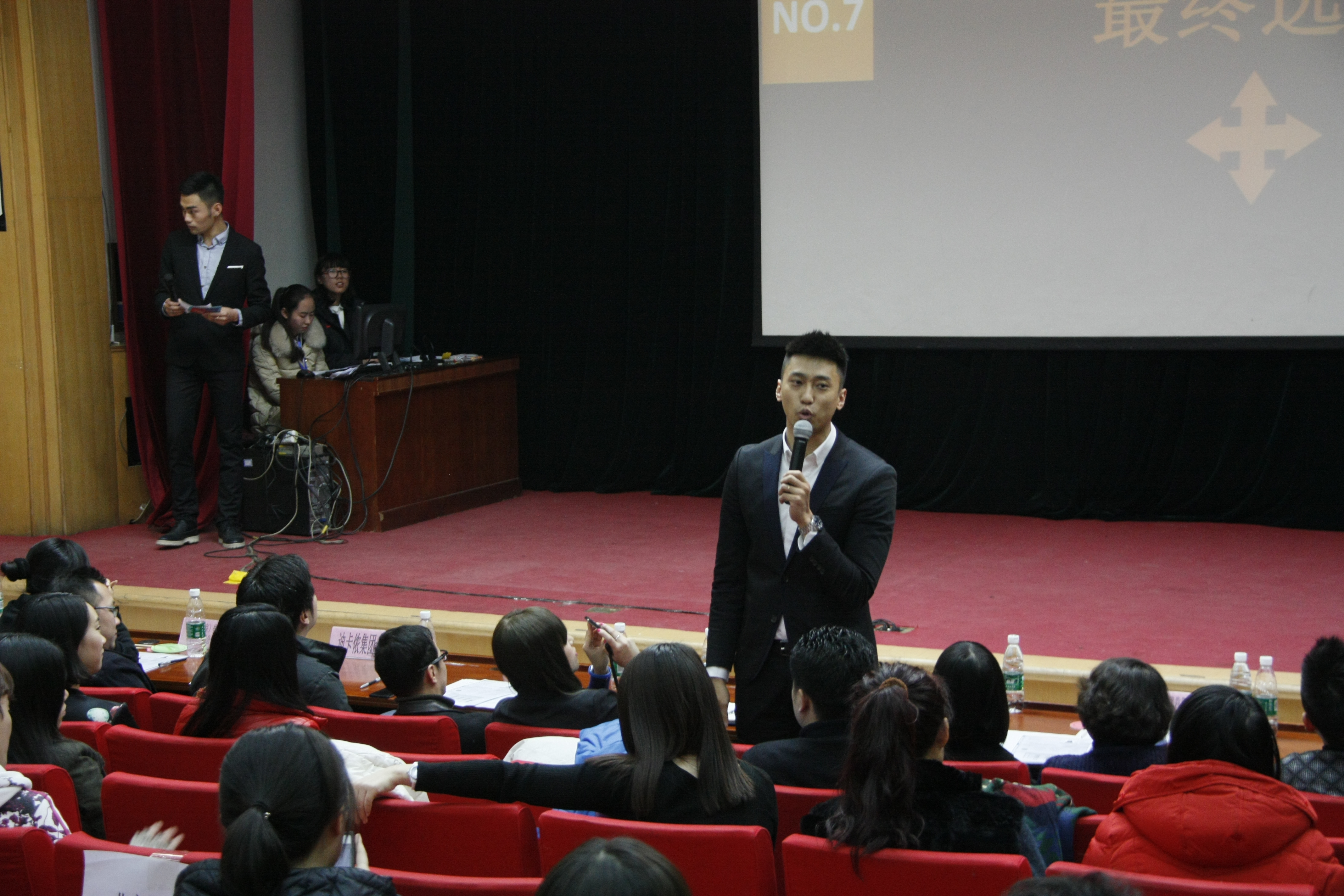 决赛上,每个导师都为参赛战队队员录制了加油视频,并对选手进行了简单的介绍。参赛选手依次上台进行自我介绍,限时3分钟;演讲完毕,选手进行“能力测评”,随机抽取由主办方精心设置的题目,30秒思考时间后进行作答,主要考察选手的专业思维能力和现场应变能力;第三环节为嘉宾自由提问;之后选手进行1分钟的自我陈述;最后为双向选择,企业代表对心仪的选手举牌表示愿意为其提供就业或实习岗位;如果多家企业举牌,则权利反转,由选手选择自己心仪的企业,然后企业代表向选手颁发录用协议书 。决赛中,选手们发挥得异常精彩,PPT制作精美、演讲声情并茂、回答问题思路清晰,充分体现了体育人应有的综合素质和精神风貌,获得了企业和在场观众的高度评价,最终每个选手都获得了企业的录用。决赛选手录用情况如下: