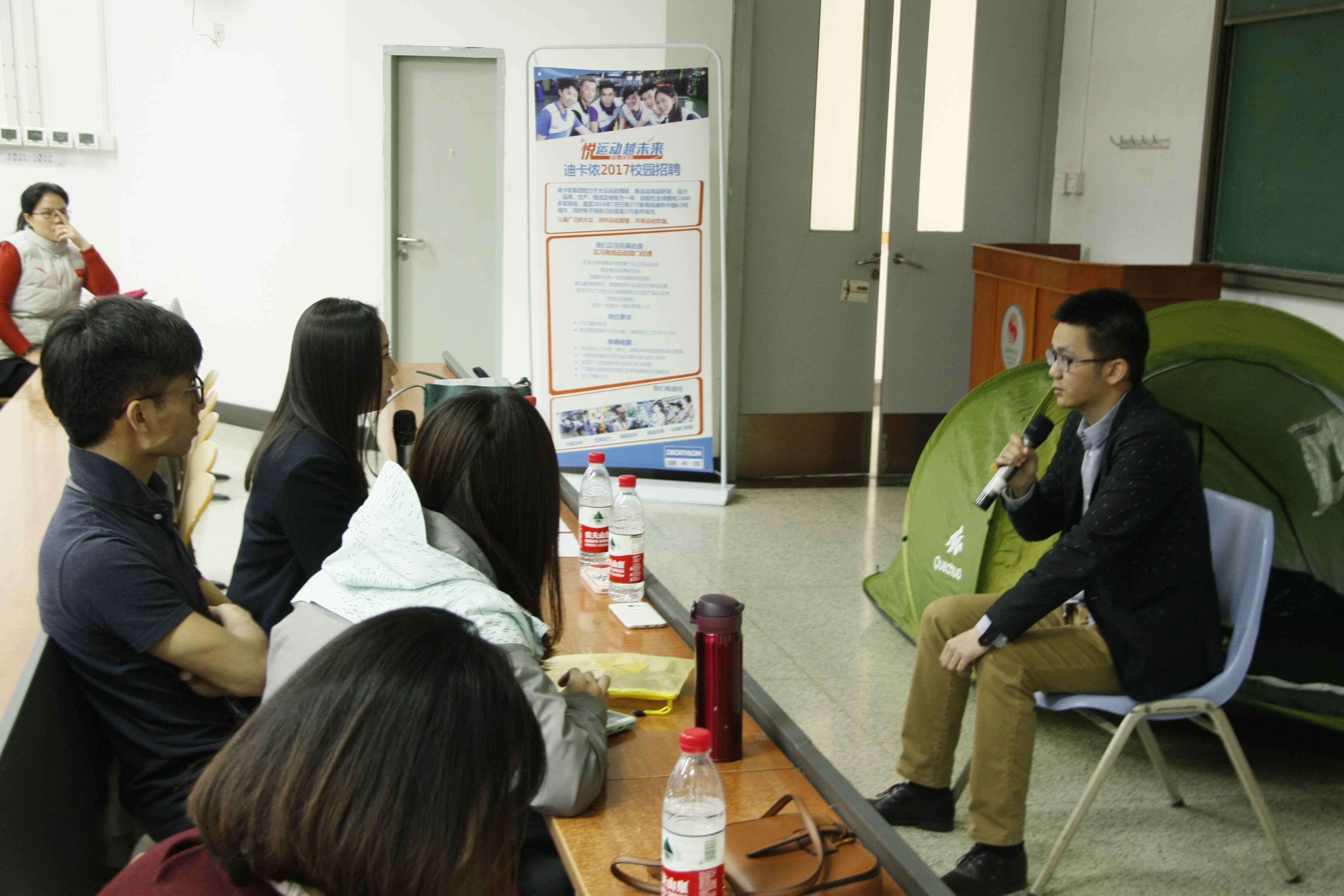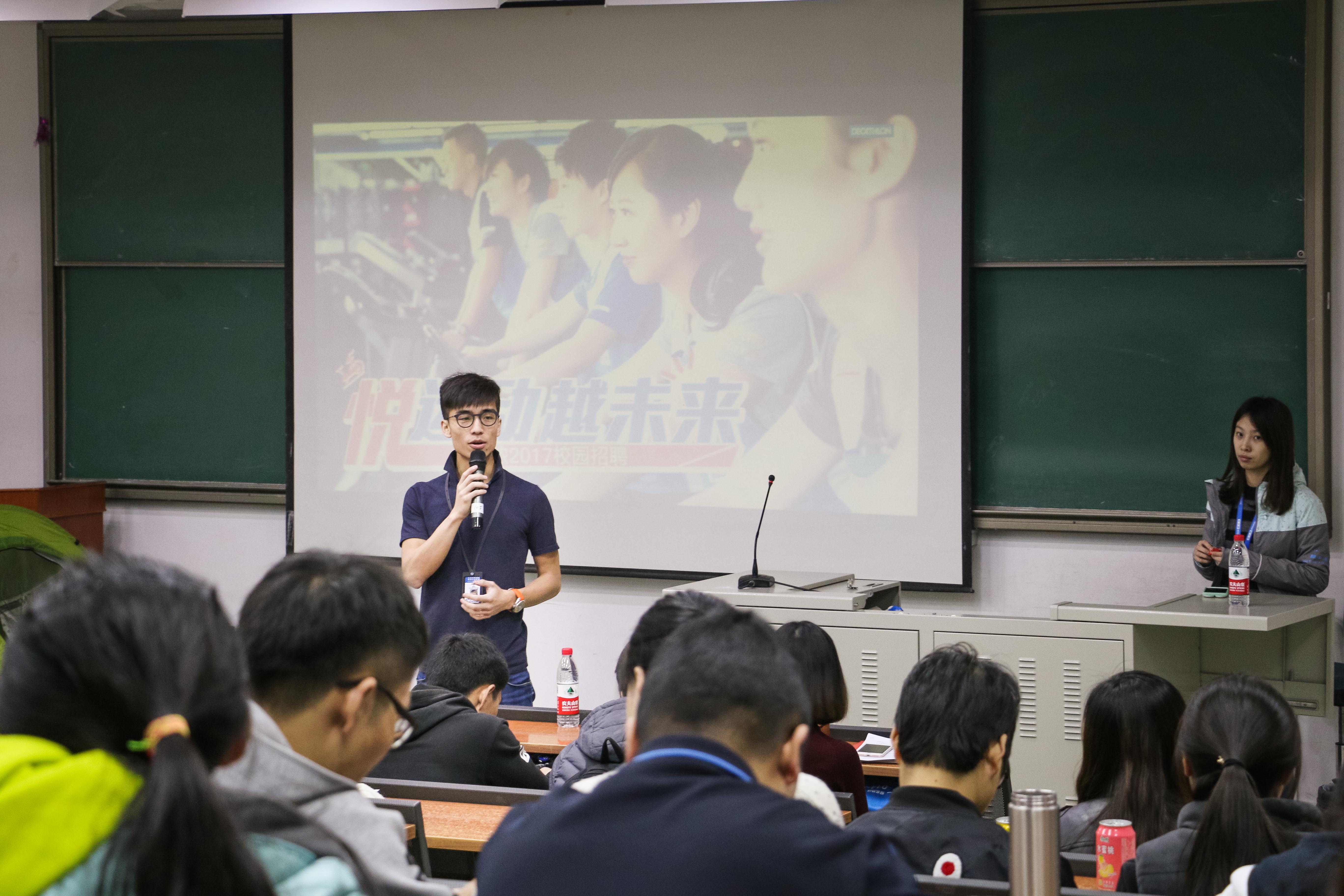 本次受邀来到课堂的有北京众辉国际体育管理有限公司人力资源经理王艳玲、迪卡侬集团校园招聘经理韩晓丹、迪卡侬旗舰店店长、我校校友冯佩剑、迪卡侬南区优秀店长孙玉冰。两个企业的人力资源负责人首先分别介绍了企业的情况以及招聘的岗位和要求,然后分别对两位毕业生进行了现场面试,其他上课学生观摩了整个面试过程,面试后面试官对学生的简历以及面试过程进行了点评,并站在企业人力资源负责人的角度,介绍了他们筛选简历的方法、学生制作简历的注意事项,以及面试中可能会问到的问题和意见建议。最后上课同学向用人单位投递简历。