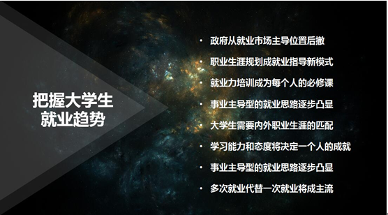 就业创业指导服务中心2017年分别举办了职场嘉年华、面试4S店等就业指导和求职技巧讲座,今后将继续加强各类培训力度,为学生们提供精准化的就业指导服务,同时也希望同学们能够不断开阔视野,关注国家改革发展变化的进程,紧跟时代快速发展前进的潮流,在崭新的机遇期里追求自身更好的发展。