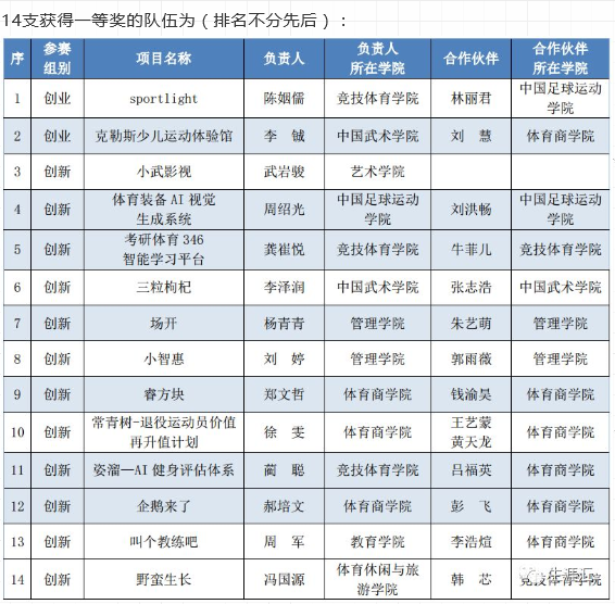 在学校的大力支持以及招生与就业工作处的全力组织下,处长周俊、王正、王少梅与体育休闲与旅游学院辅导员沈珂珂、体育商学院秦维聃老师带领北京体育大学22支队伍赴津参赛。共有14支队伍获得一等奖并晋级将在2020年春季举办的全国总决赛,占全部30支获得总决赛资格队伍总数的46.7%;占我校参赛队伍总数的63.6%。另有7支队伍获得二等奖,1支队伍获得三等奖。所有参赛队伍均获得名次。
