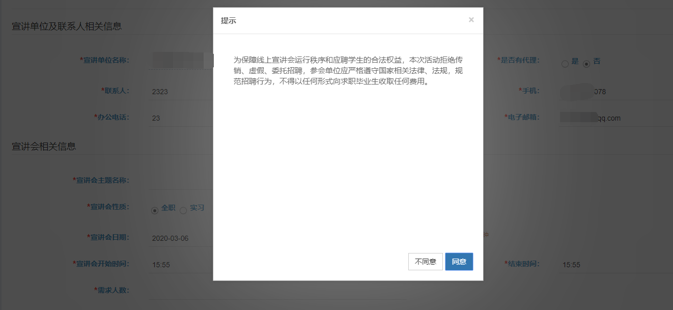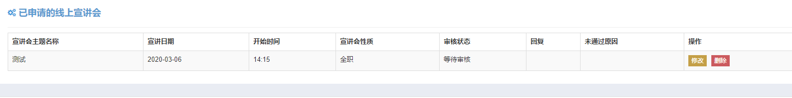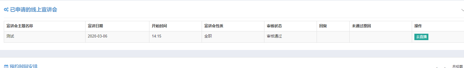 用人单位登录后,点击左侧菜单栏中“线上宣讲会预约“,点击想要预约的日期,进入线上宣讲会预约界面,填写相关信息。预约后请等待审核。如通过审核,显示‘去直播’字样 。