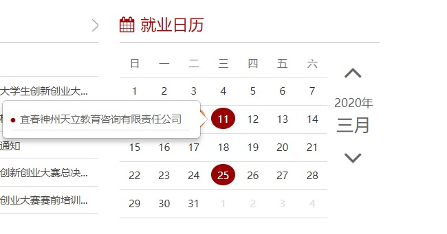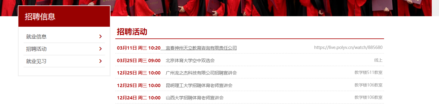 (一)“北京体育大学就业创业信息网”首页下方“就业日历”处查看,或在导航栏“招聘信息”—“招聘活动”列表中查看。