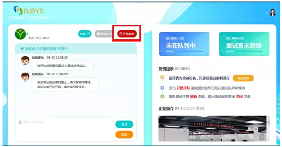 参与视频面试操作方式:在用人单位指定面试时间内进入用人单位面试间,点击"去面试"、"开始排队",等待用人单位发起视频面试;