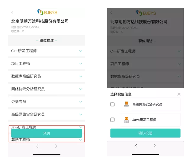 投递简历操作方式:点击单位名称-选择最下方预约按钮-选择投递职位-选择投递简历,即成功投递简历。