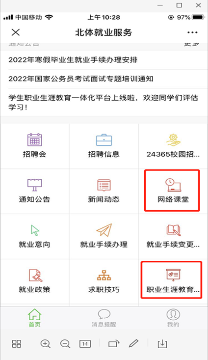 1.关注“北体就业服务”微信公众号,绑定毕业生个人账号学习;