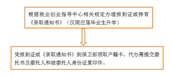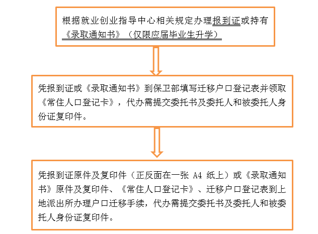 2、京内迁移:未集中办理户口迁移手续的毕业生,请于七月中旬后,先根据就业创业指导中心规定办理《报到证》,再到保卫部户籍窗口领取本人《常住人口登记卡》并交到用人单位。