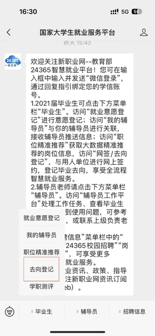 登录方式一:关注绑定“国家大学生就业服务平台”公众号, 点击“去向登记”,使用学信网账号登录。