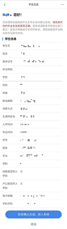 首次登录要核对本人基本信息是否正确。若信息无误,点击“信息确认无误,进入系统”;若信息有误,联系学校就业部门更正(手机号码、电子邮箱需由本人在学信网账号信息中修改)。请务必仔细核对基本信息,否则会影响后续签约、转档、落户。