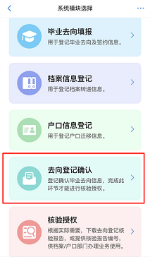 毕业生核验授权后,档案和户籍接收管理部门在办理相关手续时,可查询核验毕业生离校时相应的去向登记信息。