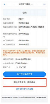 如果毕业生提交确认信息有误后发现实际信息无误,可返回“去向登记确认”界面,点击“实际信息无误,撤销确认”,撤销后重新选择“信息无误,确认登记去向”提交。