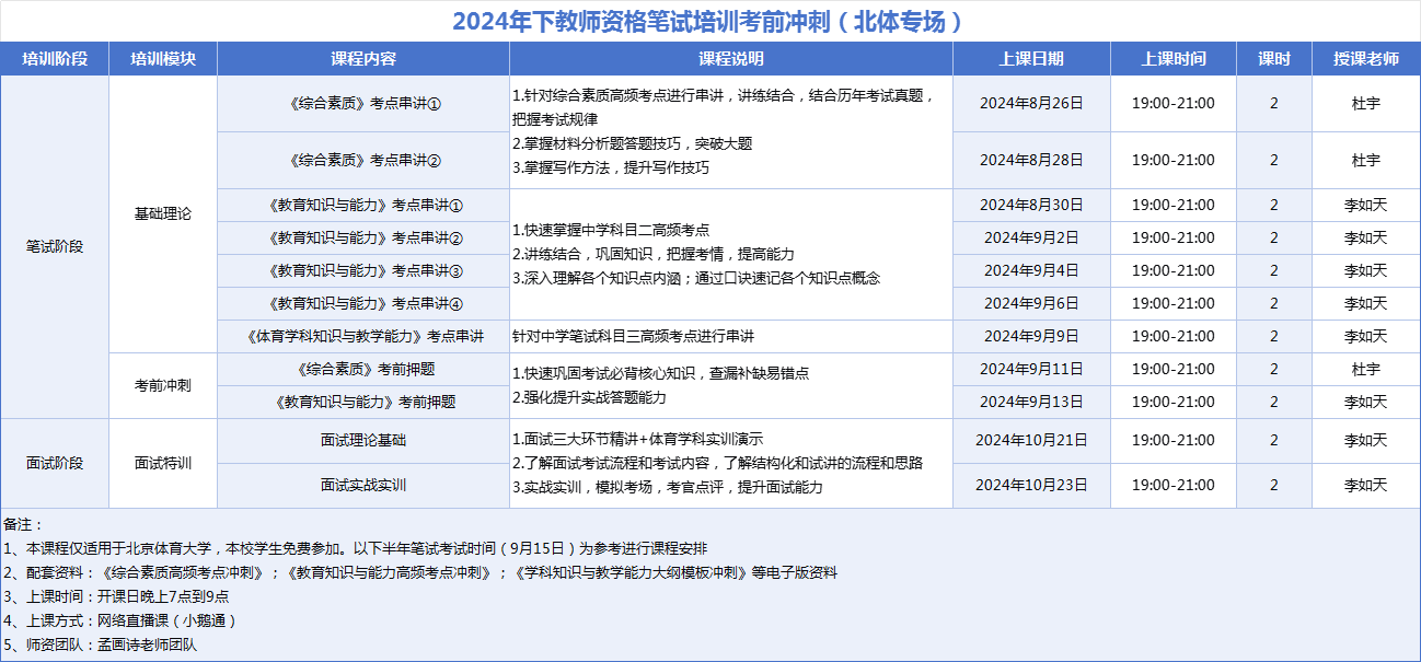 请同学们加入“北体大2024下教资培训”群(体育教育、运动训练专业学生进入专门群,每个同学进入其中一个群即可)。群中将发送课程配套资料、上课提醒,并为同学们提供教资考试相关资讯。