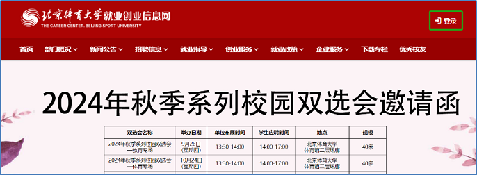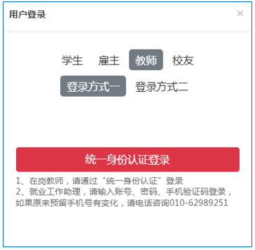 登录北京体育大学就业创业信息网//m.shishicha110.com/,选择首页右上方“登录/教师”,学院领导、辅导员选择”登录方式一/统一身份认证”登录;预设工作账号的就业助理、学生干部等,使用登录方式二登录。如果其他就业工作人员需要登录管理后台,请联系就业中心设置登录账号。
