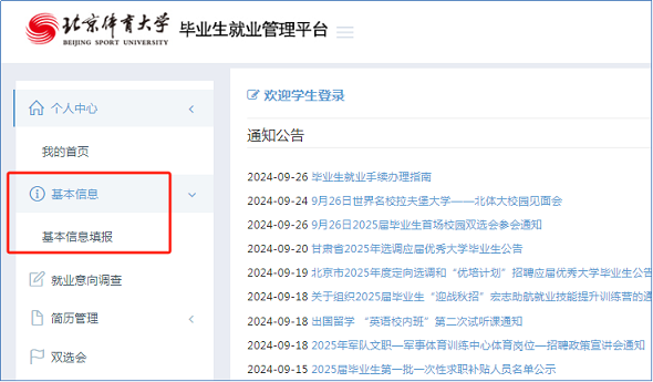 登录北京体育大学就业创业信息网//m.shishicha110.com/,选择首页右上方“登录/学生/统一身份认证登录”,使用智慧校园账号信息登录进入毕业生管理平台。点击左侧导航栏“基本信息/基本信息填报”,进入毕业生基本信息采集页面。