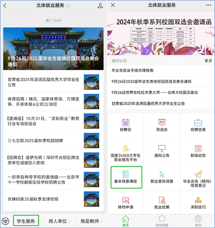 微信关注“北体就业服务”公众号,选择“学生服务/基本信息填报”,进入毕业生基本信息采集页面。第一次登录,请先绑定个人账号,账号为毕业生的学号,初始密码为学生本人身份证号后8位。