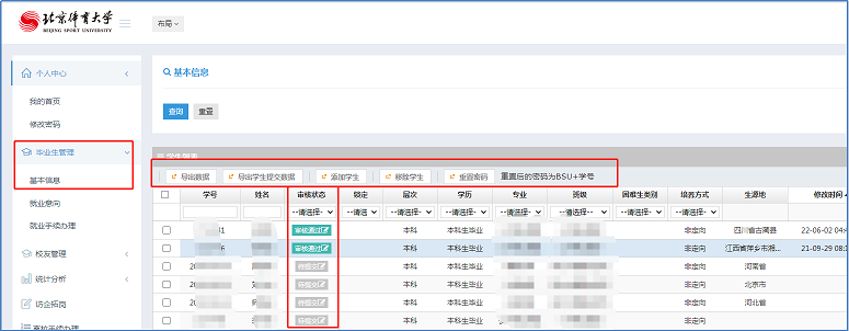 点击学生的“审核状态”按钮进入学生信息审核页面,对学生信息进行修改和审核。请10月15日前完成对所有毕业生信息的审核。