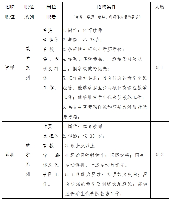 教师岗位,项目包括排球、足球、手球、羽毛球、乒乓球。其中排球1名,其他项目1名。