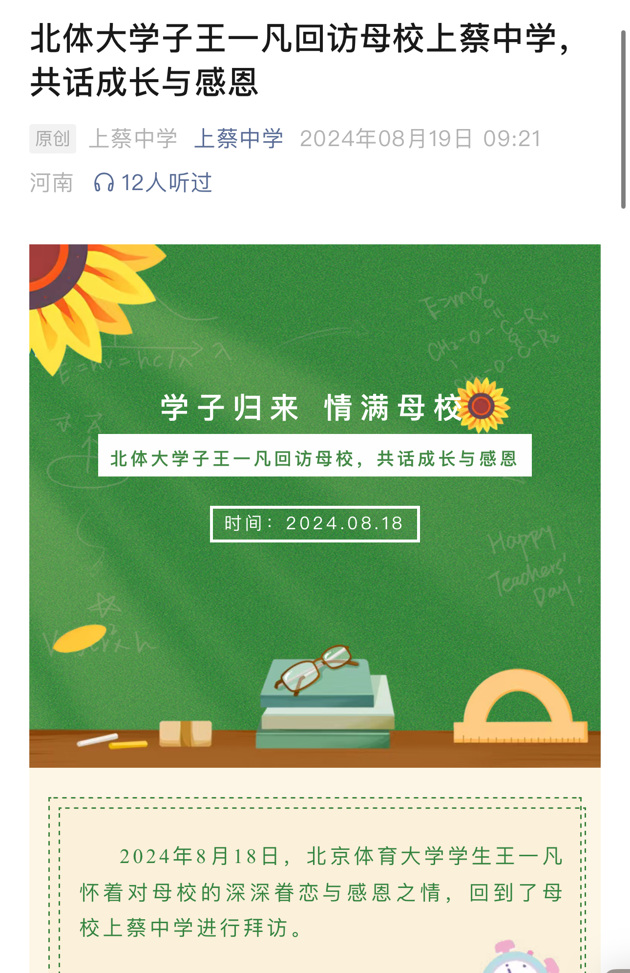 学生王一凡携团队赴母校开展公益活动