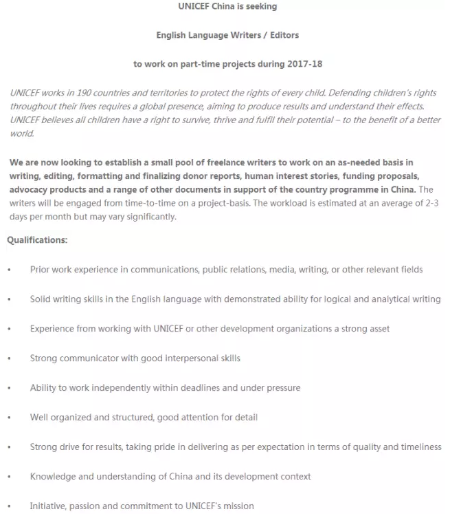 Submit a cover note, CV, financial proposal (all in English) , and a few samples of prior work tobeijinghr@unicef.org with reference “English language writer”.The financial proposal shall include your suggested daily rate for this work. Contracts will be awarded to technically qualified applicants with the lowest financial quotes.